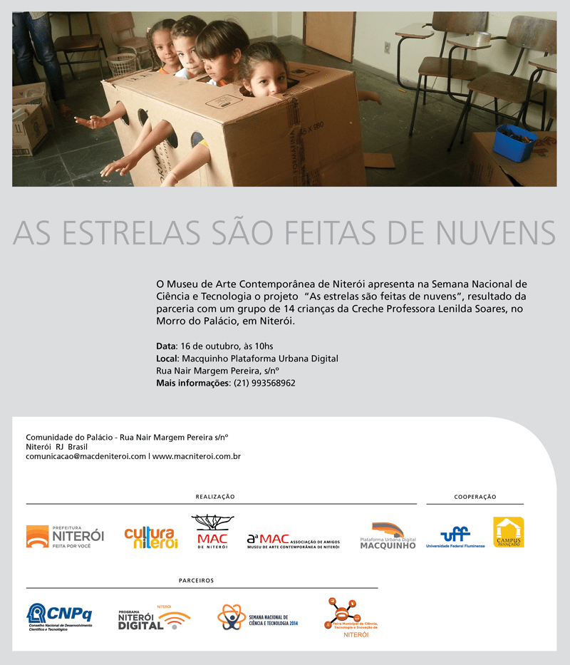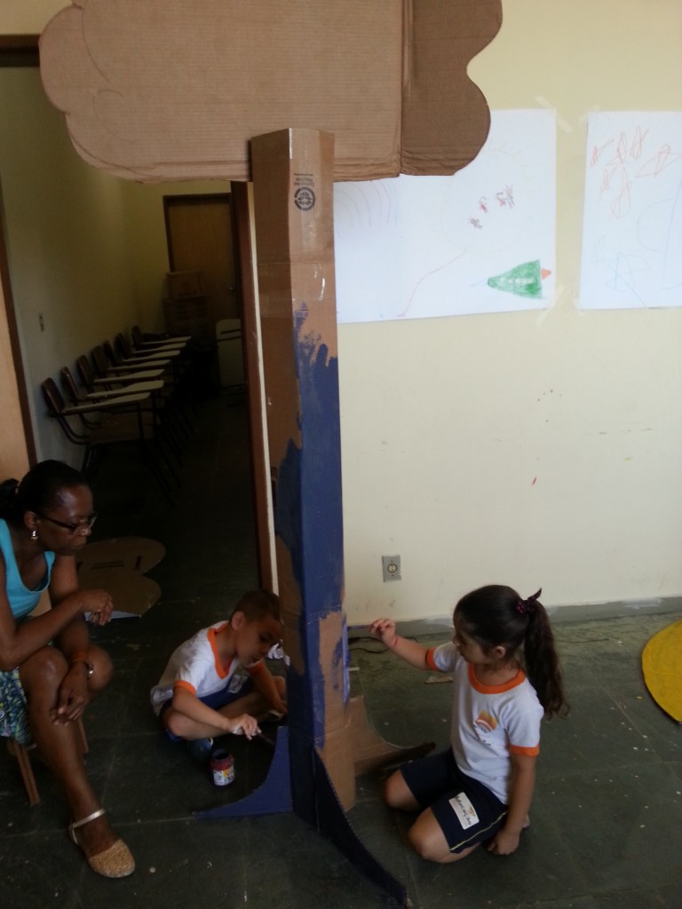 During the National Science Week of Niterói, I proposed an open agenda with a group of Kindergarten students from a school located at the Morro do Palácio Community. It was to be science based, deal with creativity, and teach them about our solar system. I went to the comitte repesenting the Contemporary Museum of Niterói (MAC-Niterói).