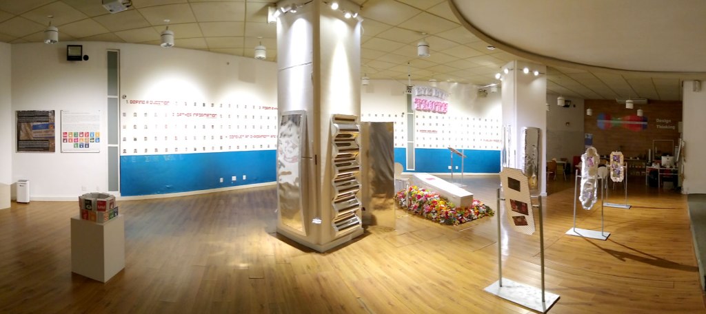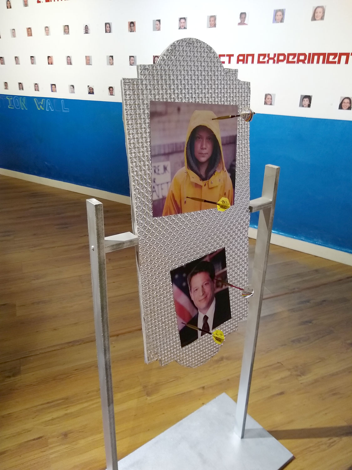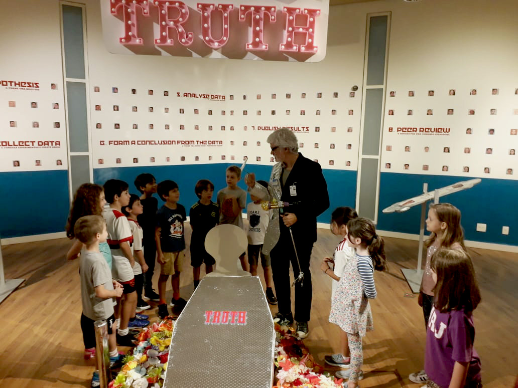 This is where Mendax comes in. This obtuse, loud, exaggerated, sparkling antihero divides the museum space with the exhibit itself. Why is he here? In this narrative/exhibit, Mendax (or just Mendi) is the brother of Truth, and Truth is in a coffin. So this exhibit and performance is also a funeral service. So why is Mendi commemorating? Is he relieved of Truth’s passing? Was Truth uncomfortable for him? Can it be uncomfortable for us all?